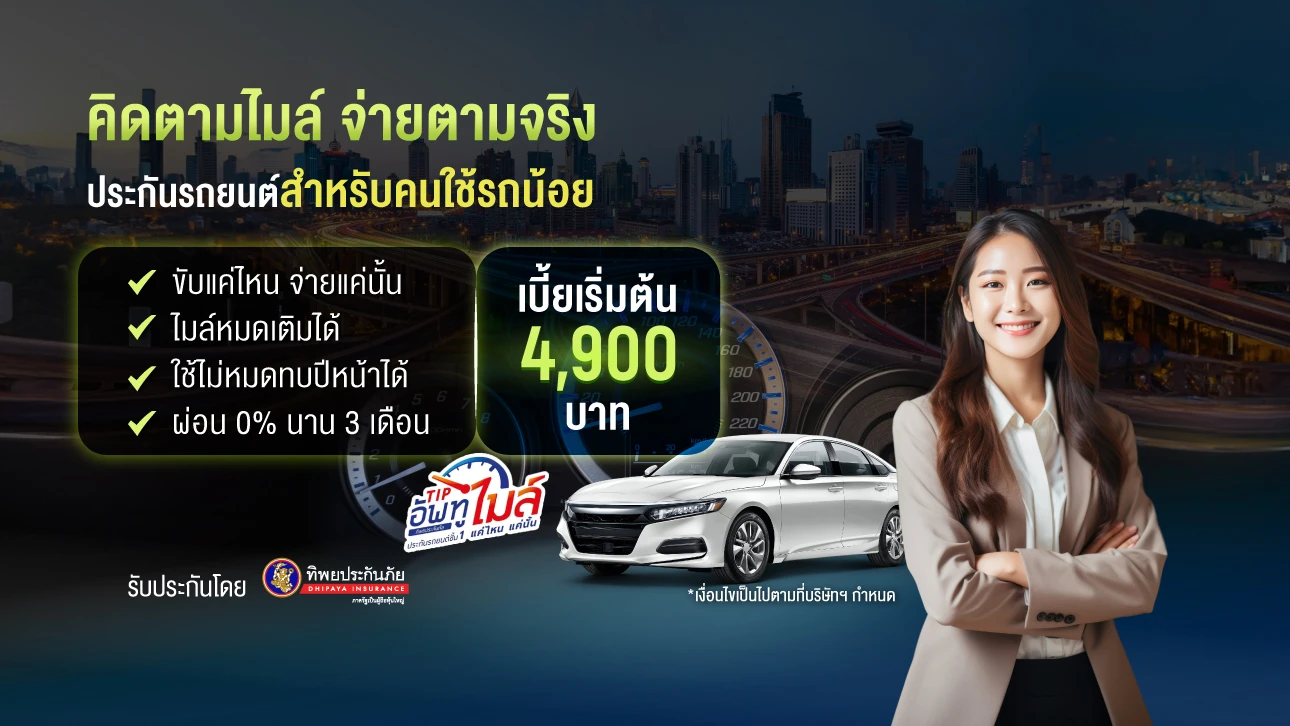 TIP Up to mile ประกันรถยนต์ชั้น 1 คุ้มครองจัดเต็ม จ่ายเบี้ยตามไมล์ ขับแค่ไหนจ่ายแค่นั้น ใช้ไม่หมด ทบต่อปีหน้า พร้อมโปรลดค่าเบี้ย และผ่อน 0% นาน 3 เดือน