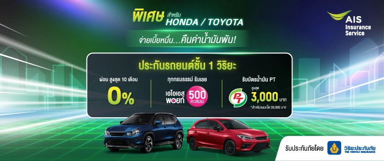ประกันรถยนต์ชั้น 1 จากวิริยะ ผ่อน 0% นานสูงสุด 10 เดือน พร้อมรับ AIS Points 500 คะแนนทุกกรมธรรม์ และบัตรน้ำมัน PT สูงสุด 3,000 บาท