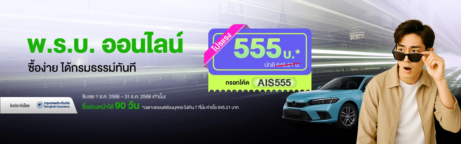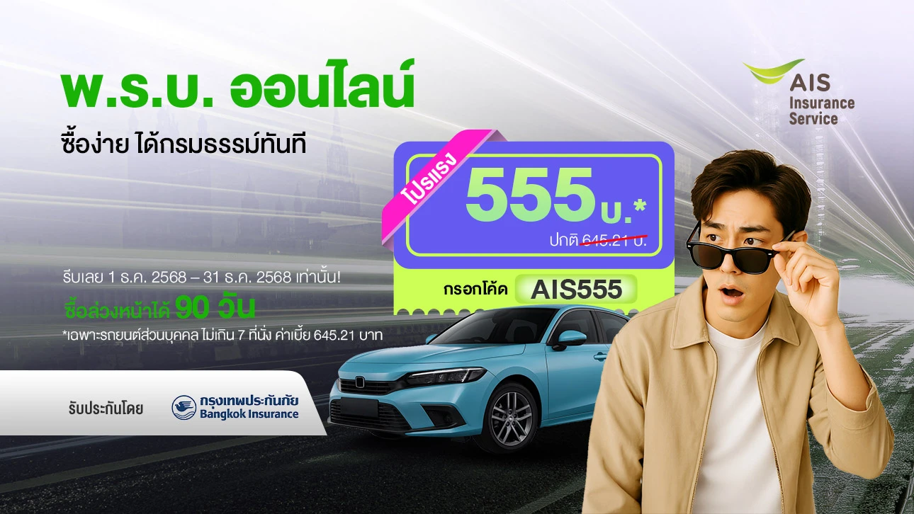 กรอกโค้ด AIS555 ค่าเบี้ยเริ่มเพียง 555 บาท จากปกติ 645.21 บาท (เฉพาะรถยนต์ส่วนบุคคล ไม่เกิน 7 ที่นั่ง)