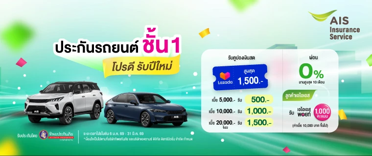 ประกันรถยนต์ชั้น 1 ทิพยประกันภัย รับ Lazada e-Voucher สูงสุด 1,500 บาท + AIS Points 1,000 คะแนน พร้อมผ่อน 0% นานสูงสุด 10 เดือน