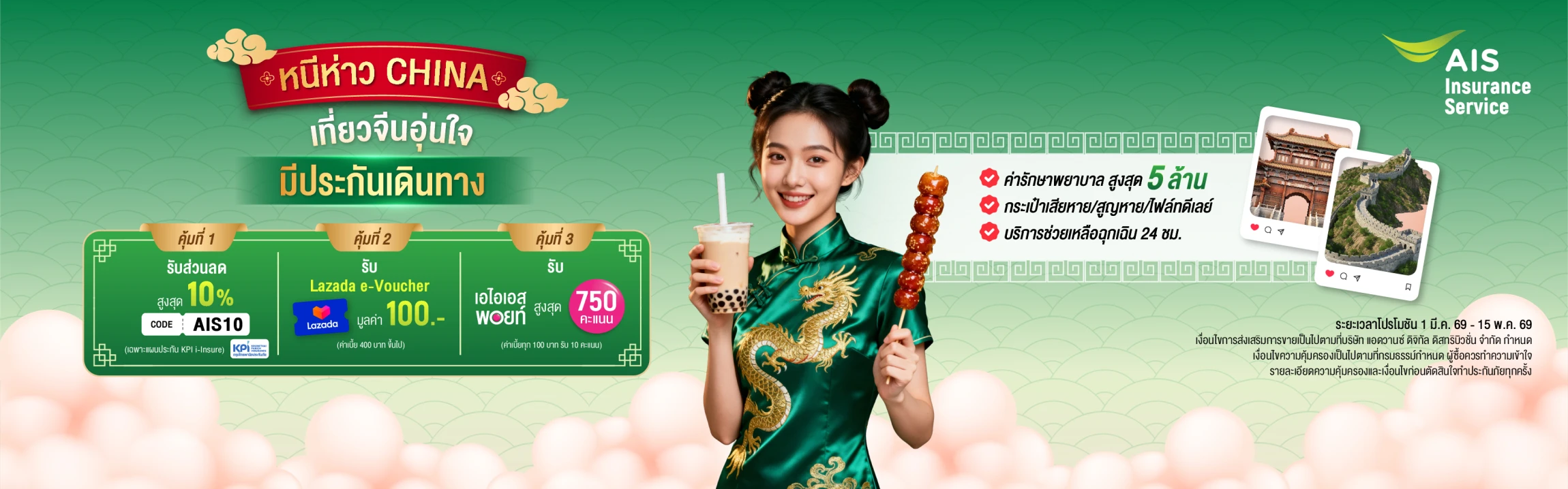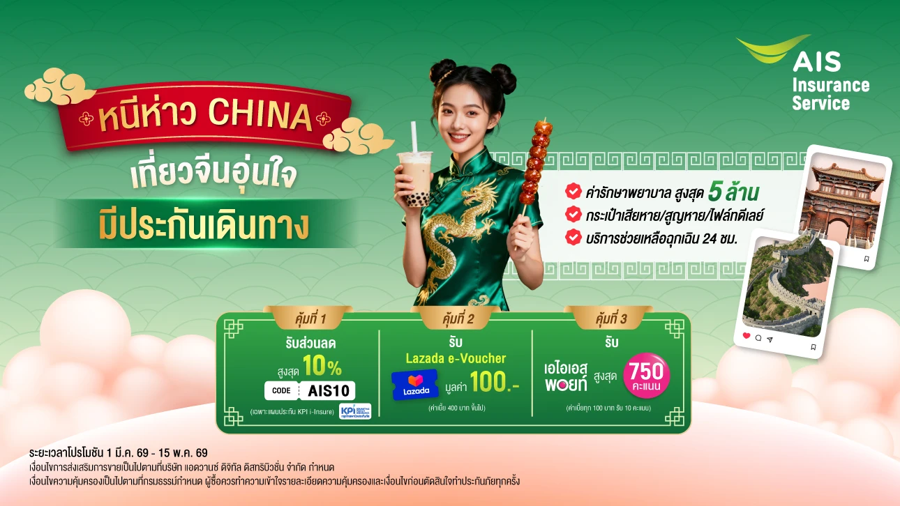 1. รายการส่งเสริมการขายนี้ จัดทำโดย บริษัท เจเนอรัลอินชัวรันส์ โบรคเกอร์ จำกัด (ใบอนุญาตนายหน้าประกันวินาศภัยเลขที่ ว00191/2525) ร่วมกับบริษัท แอดวานซ์ ดิจิทัล ดิสทริบิวชั่น จำกัด (ใบอนุญาตนายหน้าประกันวินาศภัยเลขที่ ว00012/2561) เพื่อมอบสิทธิประโยชน์ให้แก่ลูกค้าที่สมัครและชำระค่าเบี้ยประกันภัยการเดินทางต่างประเทศ KPI i-Insure แบบรายเที่ยว ทุกแผน โดยลูกค้าสามารถกรอกรหัสเพื่อรับส่วนลด “AIS10” บนเว็บไซต์ https://insurance.add-digital.co.th ในระหว่างวันที่ 1 มีนาคม 2569 – 15 พฤษภาคม 2569